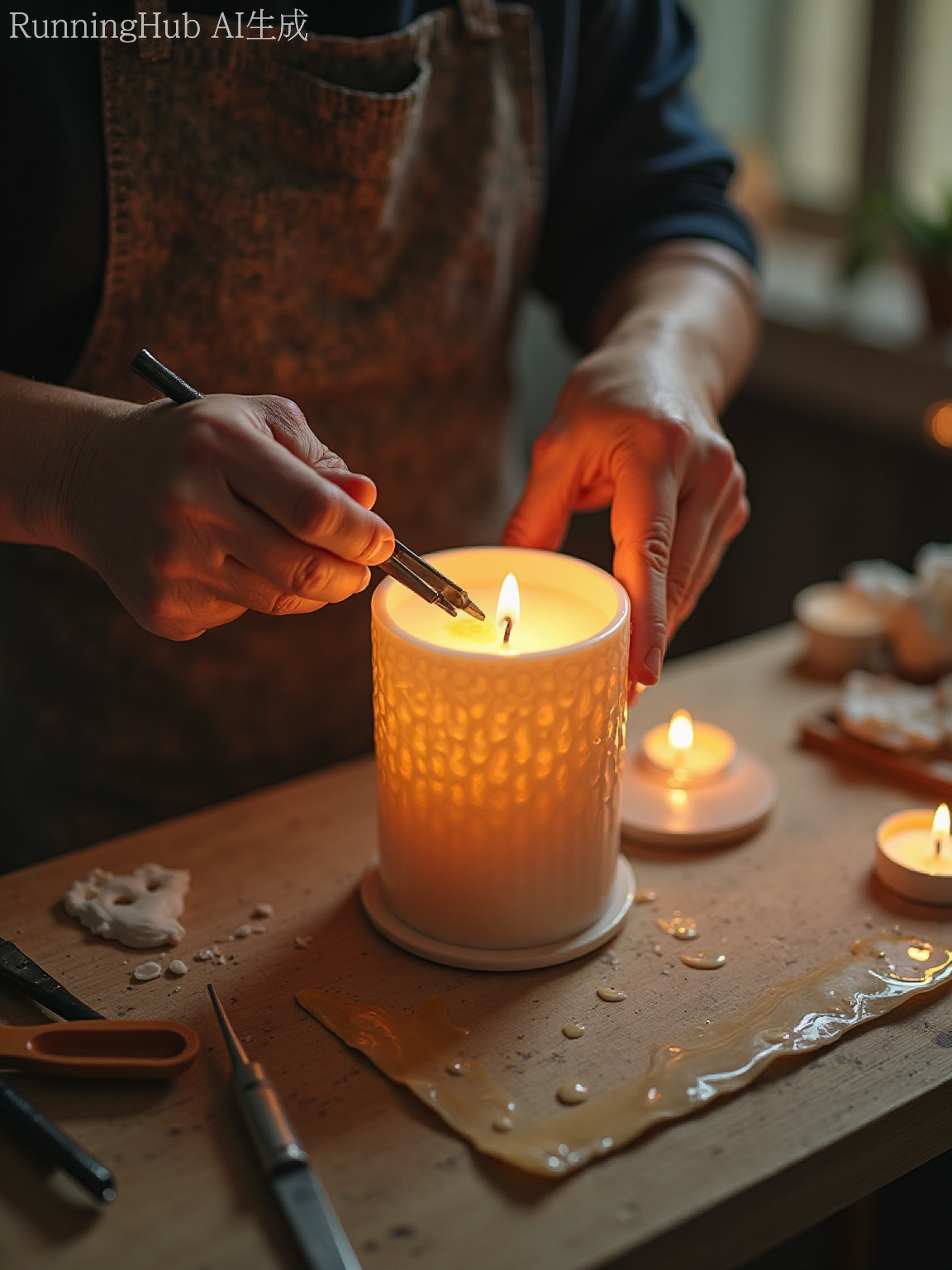 At 55°C, the wax is poured into molds. The artisan lifts the mold and gives it three gentle shakes—large bubbles rise, small bubbles burst. The surface instantly becomes as smooth as a mirror, representing the "face" of a hand-poured cup candle.